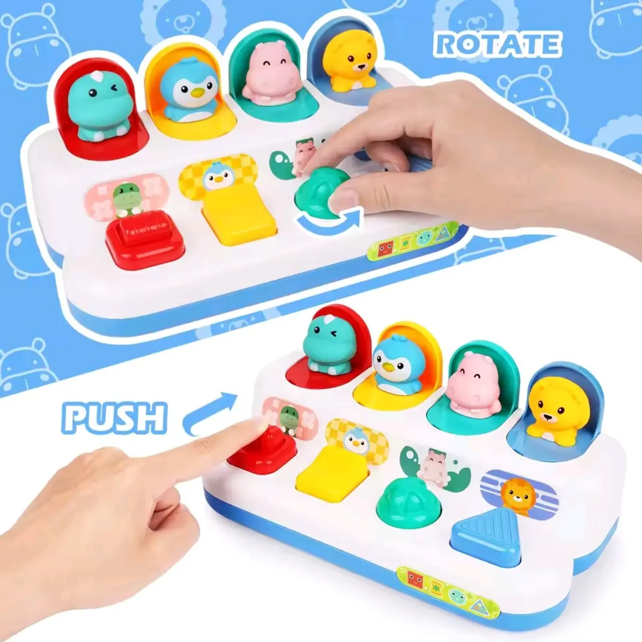 Este divertido juguete de animales emergentes está diseñado para estimular el desarrollo temprano de los niños a partir de los 18 meses. Cada botón activa un mecanismo diferente que hace aparecer a un simpático animal, ayudando a los pequeños a descubrir la relación causa-efecto mientras se divierten.
