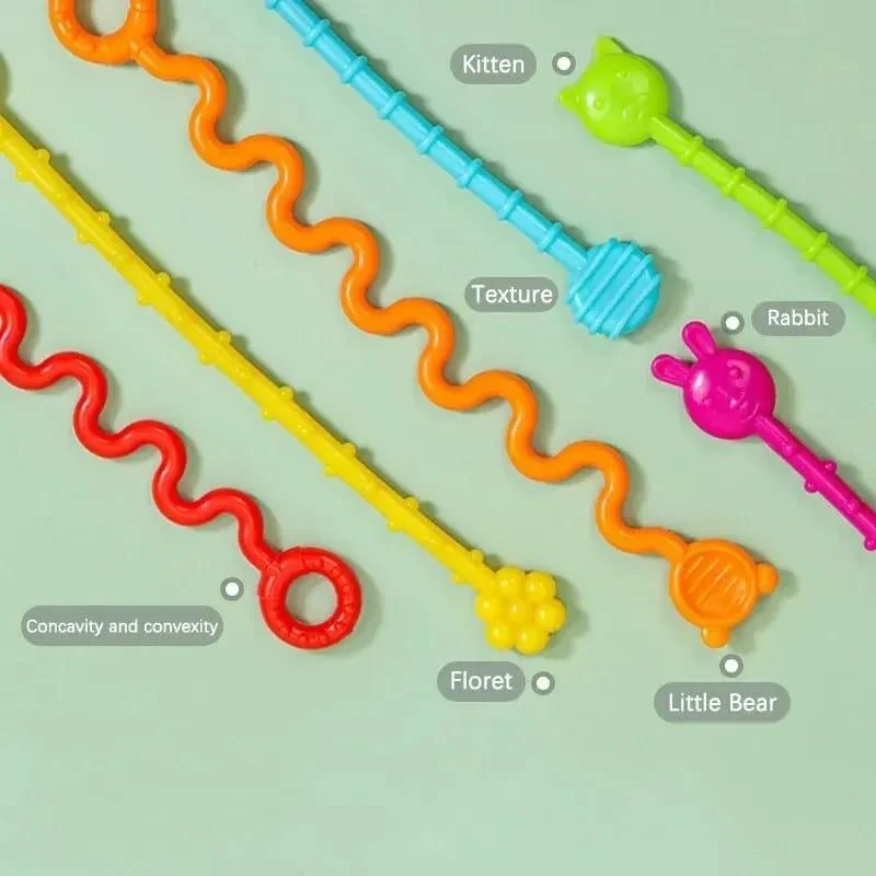 Desarrollo de la motricidad fina y coordinación: Al agarrar, tirar, y manipular las cuerdas de silicona, el bebé practica la coordinación ojo-mano y fortalece su motricidad fina.