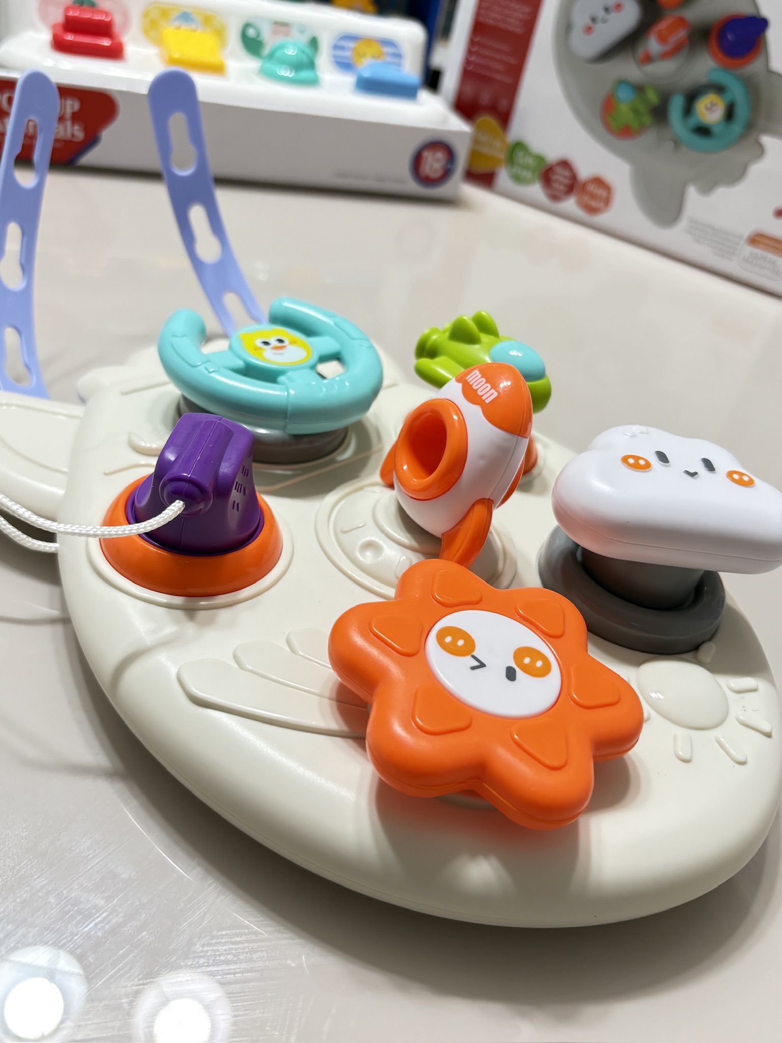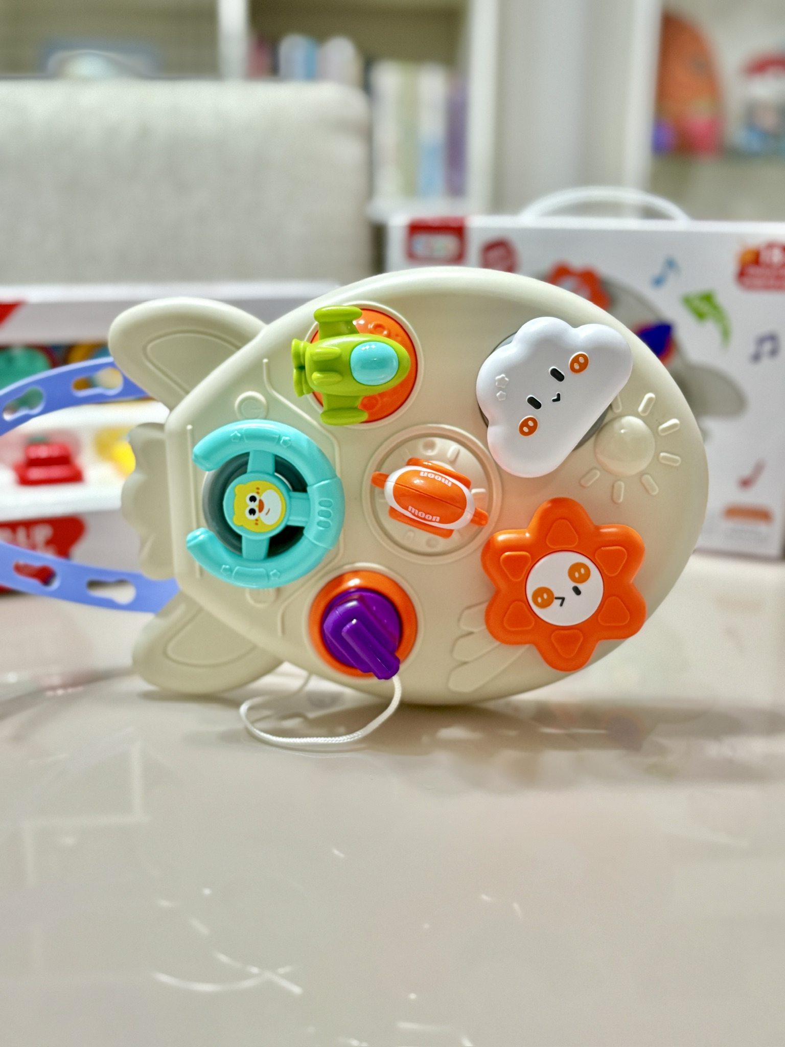 Este colorido tablero sensorial con temática de cohete está diseñado para estimular el desarrollo temprano de bebés y niños pequeños a partir de los 18 meses. Incluye divertidos personajes giratorios, botones de colores y elementos móviles que invitan al niño a explorar con sus manos y sentidos.